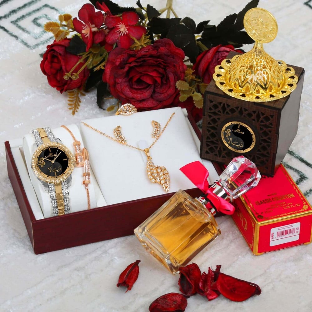 احصلي على أجمل هدايا العيد للام مع طقم هدايا نسائي فاخر من متجر هدايا القمة، مصمم خصيصًا ليعبر عن الحب والتقدير في هذه المناسبة العزيزة. يحتوي الطقم على ساعة سهرات أنيقة محفورة بالاسم مع ضمان سنة يشمل الماء والمكينة، طقم إكسسوارات زركون (سلسال، حلق، خاتم)، سوارة سحاب مسمار راقية، مبخرة خشبية مخصصة بالاسم، وعطر ميني فخم، بالإضافة إلى كيس وكرت ماركة هدايا القمة. اجعلي عيد والدتك مميزًا مع هذه الهدية الفاخرة التي تعكس ذوقك الرفيع واهتمامك.