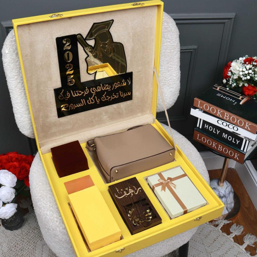 احصل على هدايا تخرج أفكار تخرج بسيطة وفخمة من متجر هدايا القمة، بوكس حصري بتقسيم جلد فاخر يكشف عن جمال كل قطعة بداخله. يحتوي البوكس على شنطة نسائية جلدية بألوان متعددة، نظارة فاخرة مع كافة الملحقات، مبخرة خشبية مع عطر بخور كمبودي فاخر، طقم إكسسوارات (سلسال وحلق) بدرجة أولى مع ضمان سنة، ساعة أنيقة ضد الماء، وخلفية أكريليك ذهبية مع عبارة مخصصة حسب الطلب. هدية تجمع بين الرقي والفخامة لتكون ذكرى تخرج خالدة.
