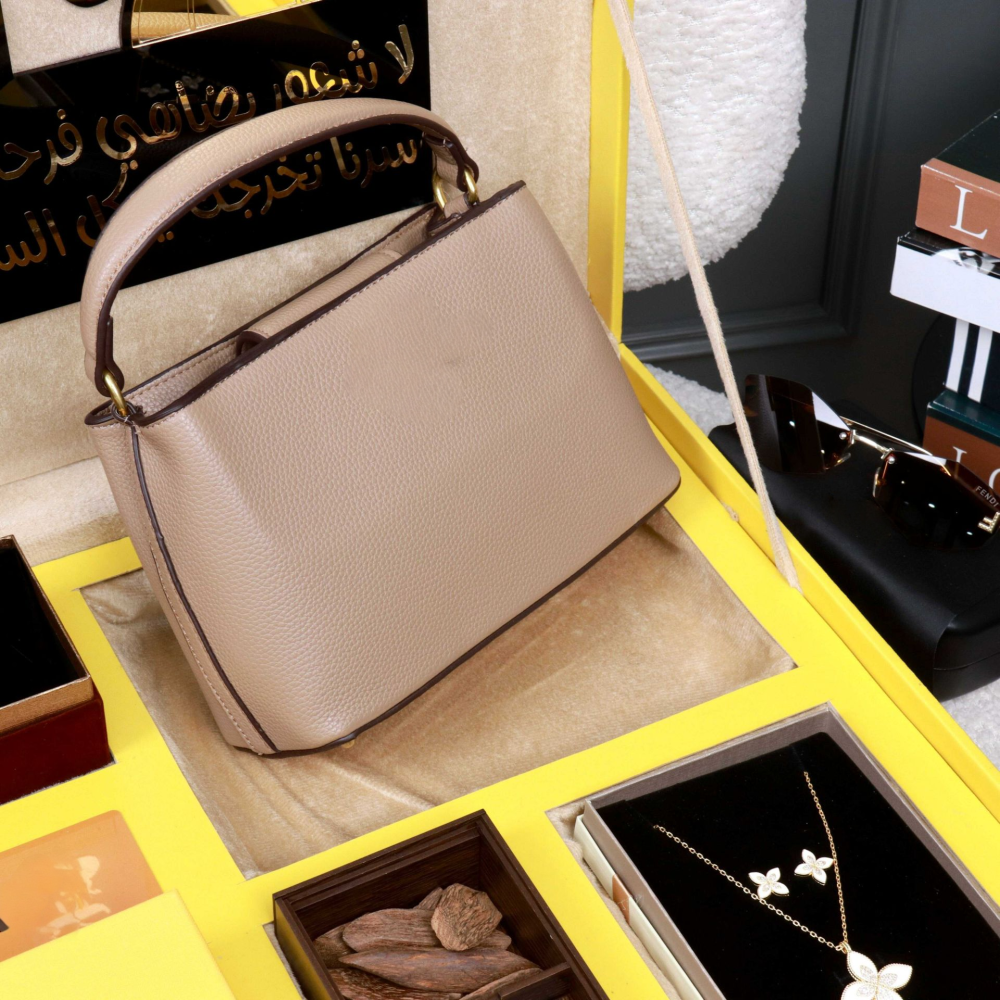 بوكس أنيق بتقسيم جلد فاخر، شنطة جلدية، نظارة فاخرة، مبخرة مع بخور أصلي، إكسسوارات فخمة وساعة ضد الماء.