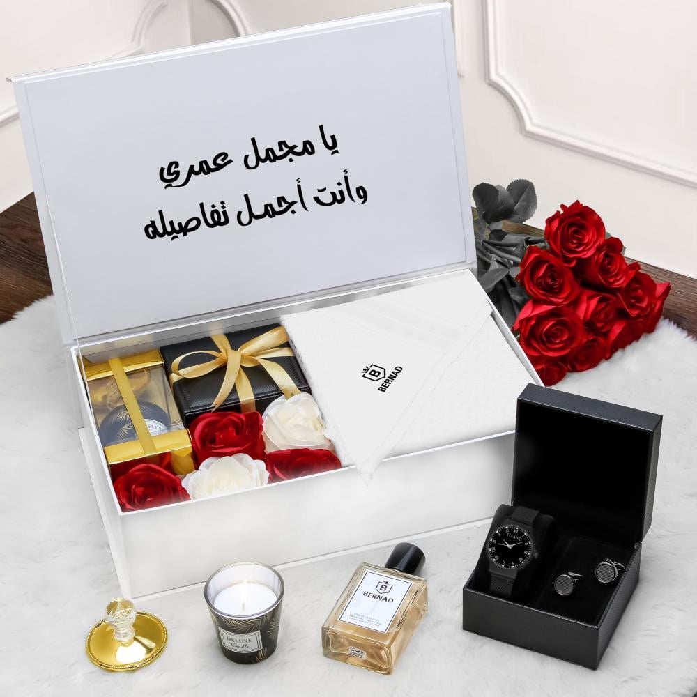 تصاميم هدايا تخرج رجالي فاخرة للزوج | طقم شماغ وعطر وساعة وورد بتنسيق مميز